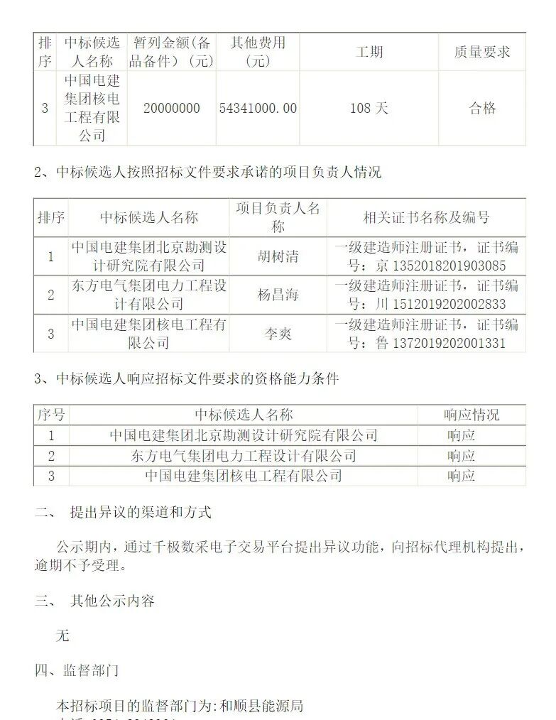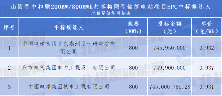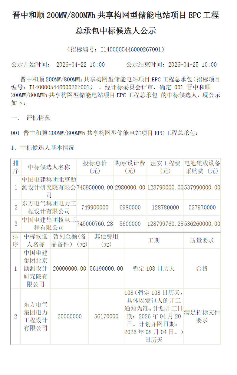 北极星储能网讯:2026年4月22日,山西晋中和顺200MW/800MWh共享构网型储能电站项目EPC工程总承包中标候选人公示。前三名中标候选人依次为:中国电建集团北京勘测设计研究院有限公司、东方电气集团电力工程设计有限公司、中国电建集团核电工程有限公司。投标单价区间为0.931~0.937元/Wh。